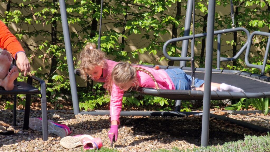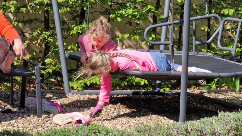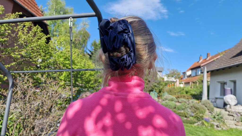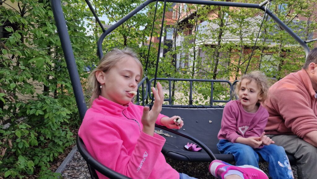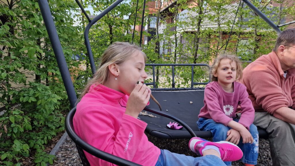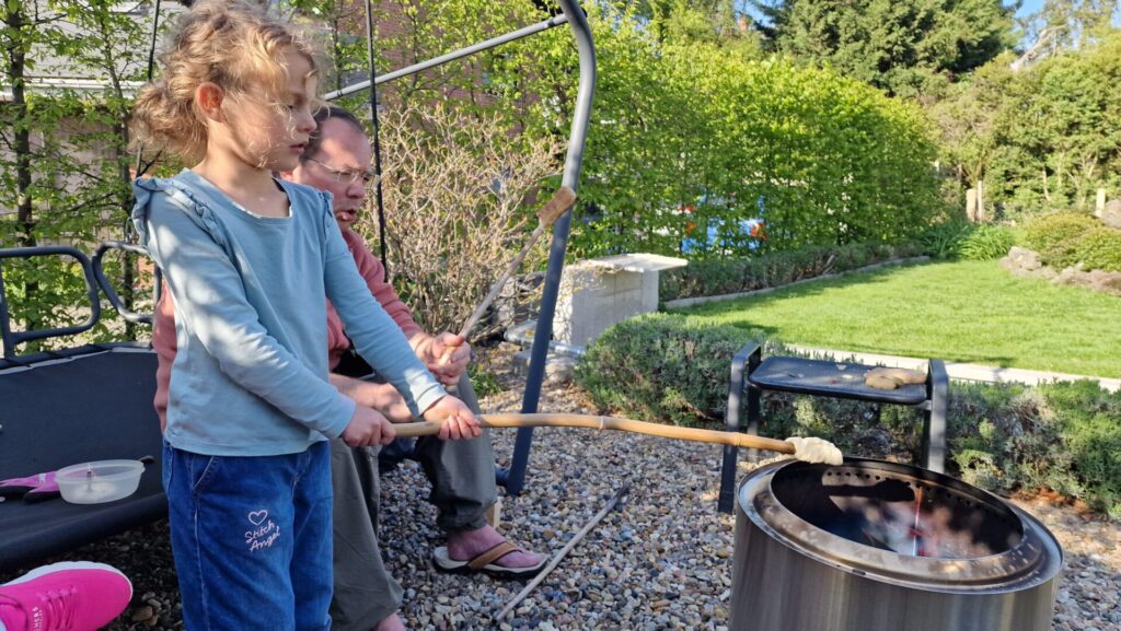 Zum Abendessen katapultierten wir uns in die Steinzeit. Es gab Stockbrot am Lagerfeuer mit Quark – und Hagelzucker – ohne kompliziert bedienbares Besteck, was allen schmeckte. Gestärkt tobten die beiden kleinen Hexen durch den Garten, sammelten Kräuter, fischten Schnecken aus dem Teich – iihh! Außerdem rührten sie in der Regentonne den ultimativen Zaubertrank an. Leider konnte der nicht die zu Besen umfunktionierten Stockbrot-Stäbe zum Fliegen bringen …
