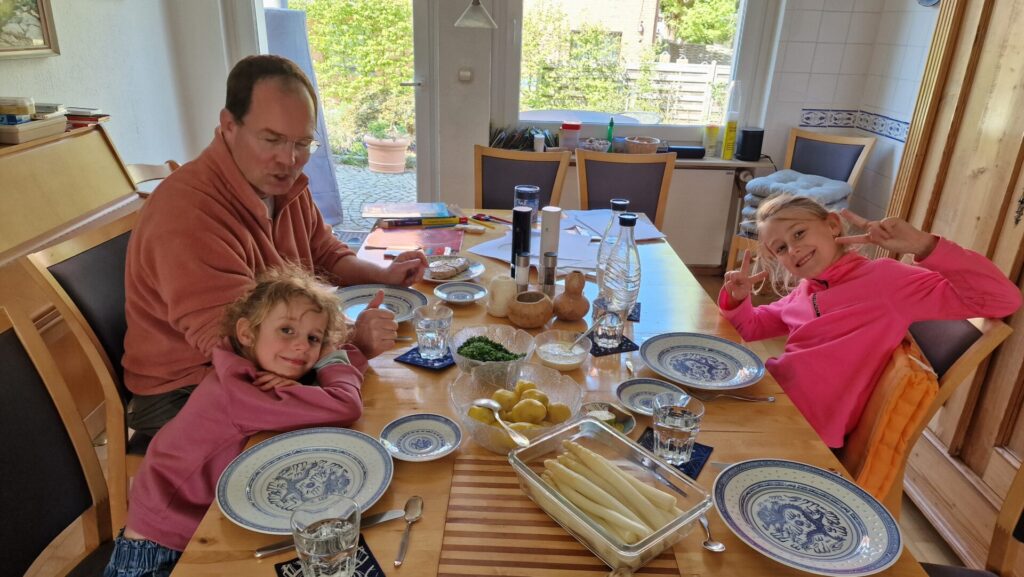 Zu Mittag wurde dann Einiges der Rezeptvorschläge als Test- und Benimm-Essen gleich in die Tat umgesetzt. Wir haben nun eine Sauce Hollandaise Expertin im Haus, die diese in Null-komma-Nichts herstellen kann (frag das Familien Kochbuch ;))! Besonders fanden aber auch die von Oma und Lilli gemeinsam in Schokolade getauchten Erdbeeren zum Nachtisch Anklang.