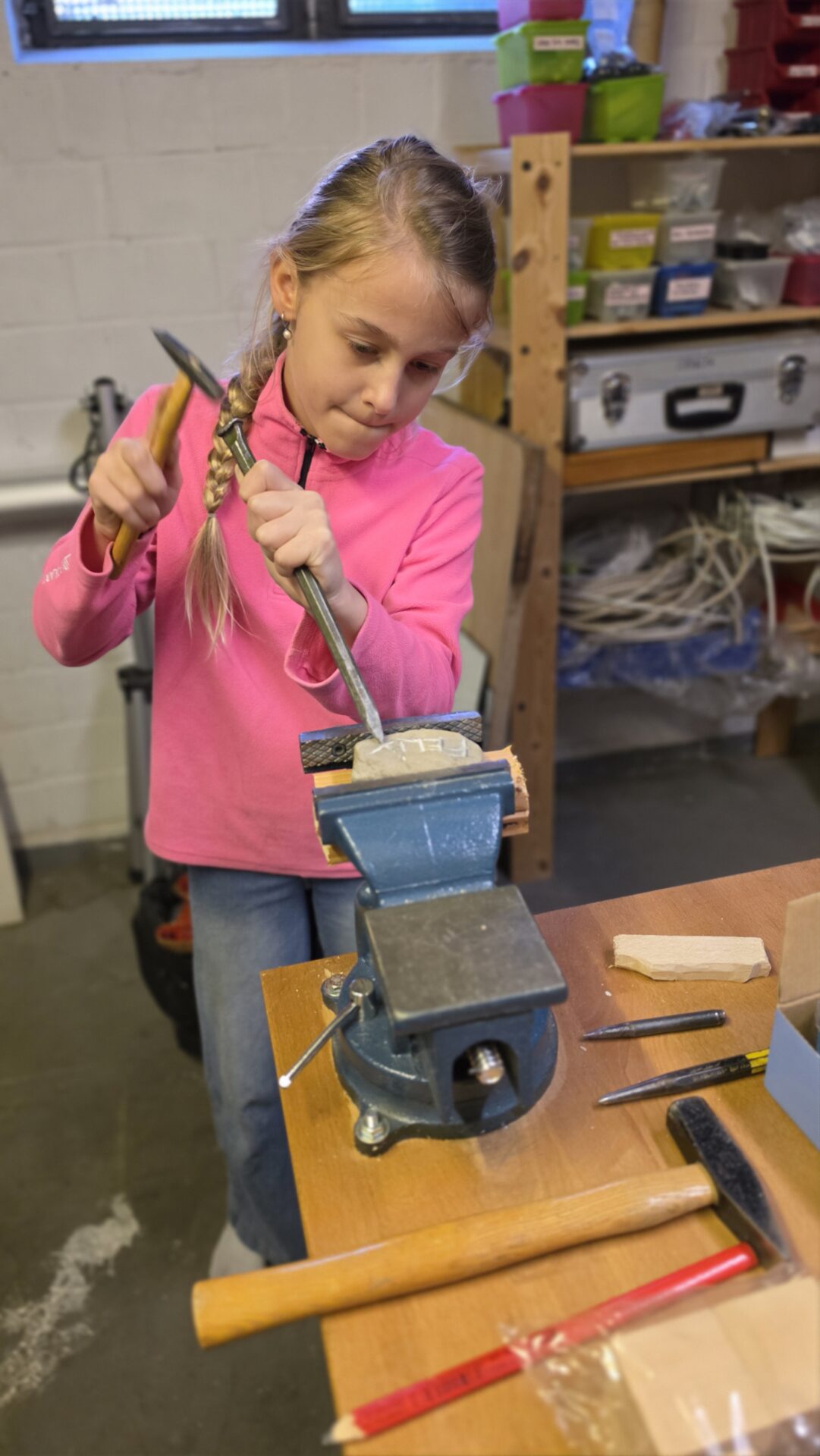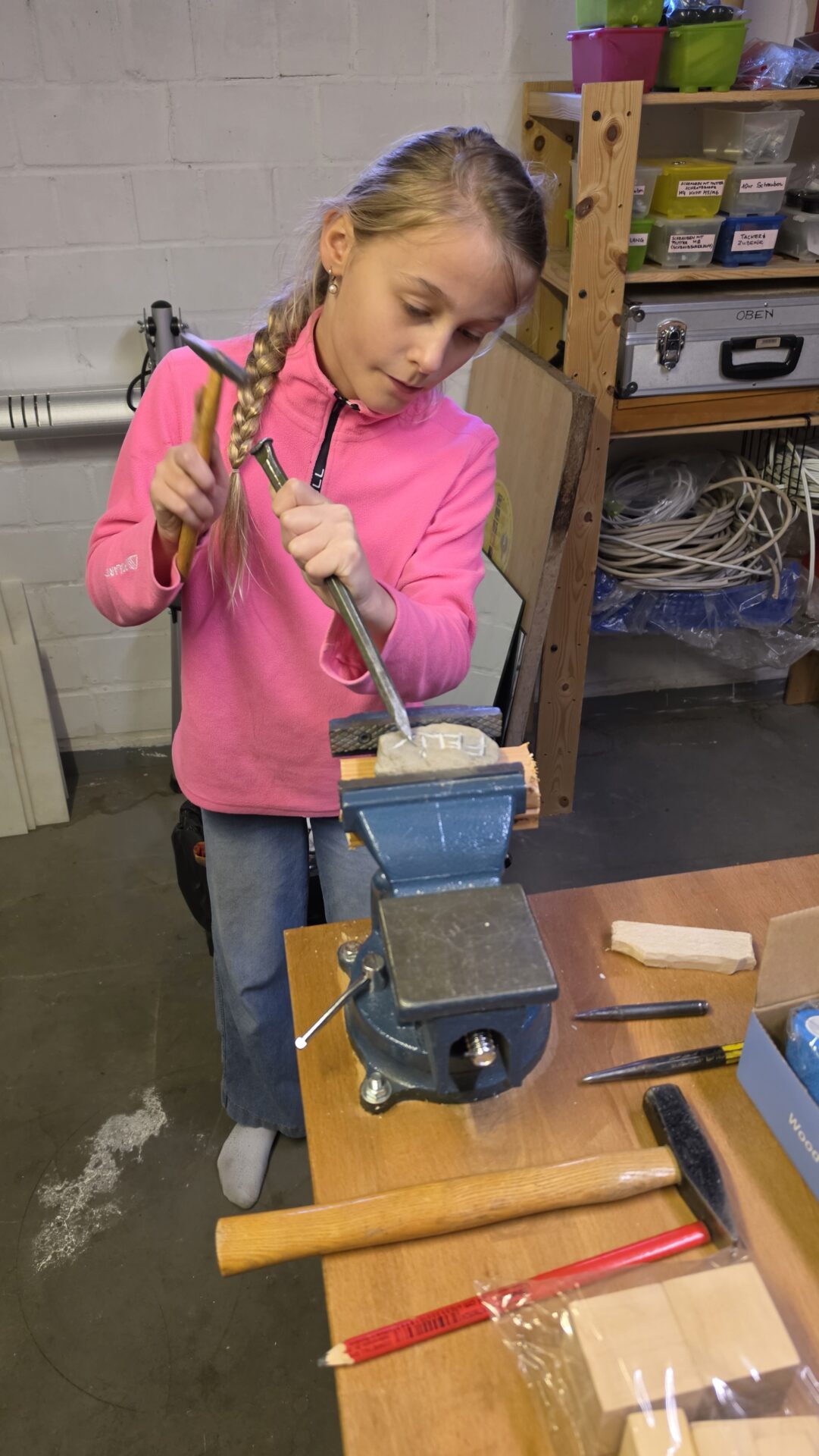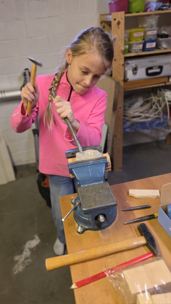 Gestärkt ging es daran die physischen Talente zu üben. Während der Wölflinge Nachwuchs Lilli trainiert werden wollte, war Stella in der Werkstatt mit Hammer und Meißel zu Gange. Holz ist keine Herausforderung – heute mussten es Steine sein. Ein sorgfältig hergestelltes und verpacktes Geschenk für Felix war das Ergebnis …